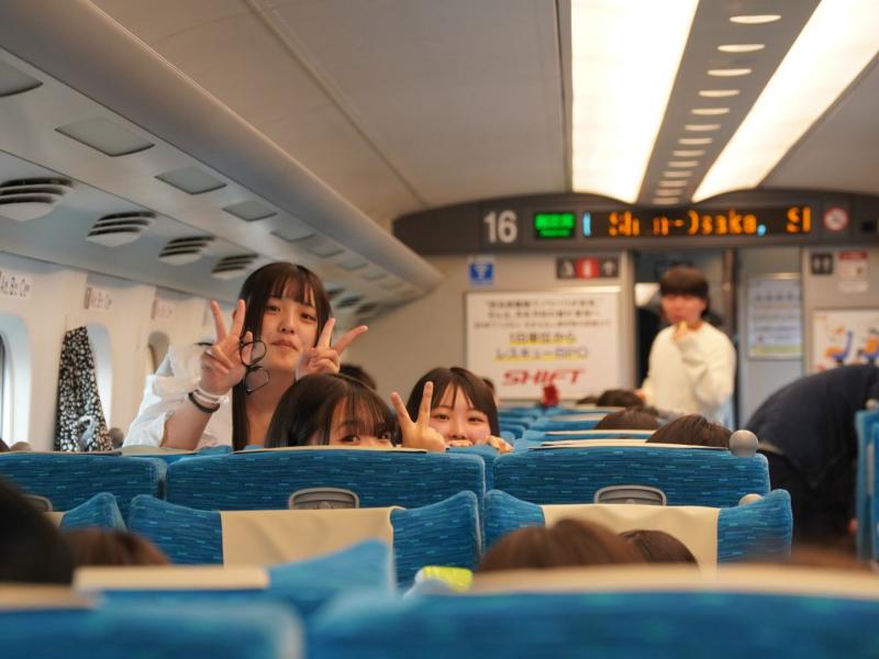 ▲広島への期待を膨らませ新幹線のぞみ63号に乗る生徒たち