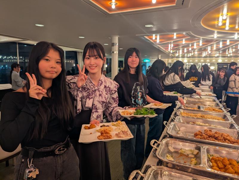 広島での平和学習後、広島駅での自由行動の後に、再び新幹線のぞみに乗り込み神戸まで移動しました。神戸では「神戸メリケンパークオリエンタルホテル」に泊まり、夜ご飯は船の上でのディナークルーズでの食事でした。食後のクルーズ船デッキで写真撮影をしている生徒がみられました。1,000万ドルの夜景に見とれている生徒が多かったです。