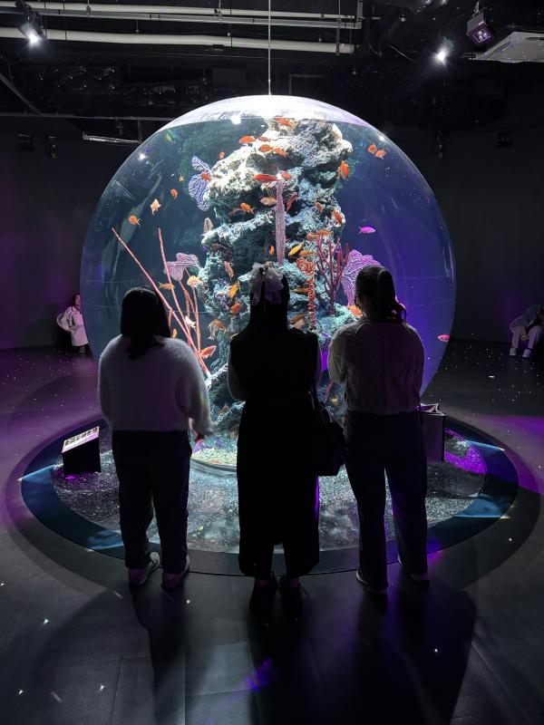 ▲「アトア átoa」水族館にて、デジタルアートと融合した展示を見る生徒と研修を受ける様子