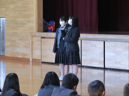 「4月12日(火)本校体育館において、部活動紹介が行われました。 先輩たちが披露する動画やパフォーマンスを、新入生は集中しながらも楽しそうに見つめていました。」