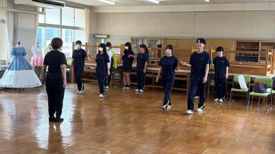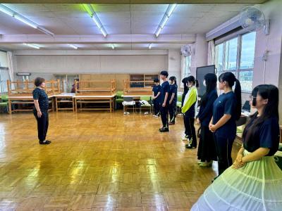 講習会では、まずストレッチや基本的なウォーキング、ポージングの基礎について丁寧にご指導いただきました。その後、生徒たちはファッションショーで実際に着用する靴と衣装を身につけての実践練習を行い、歩き方やポージングについて一人ひとりに合わせた具体的なアドバイスをいただきました。